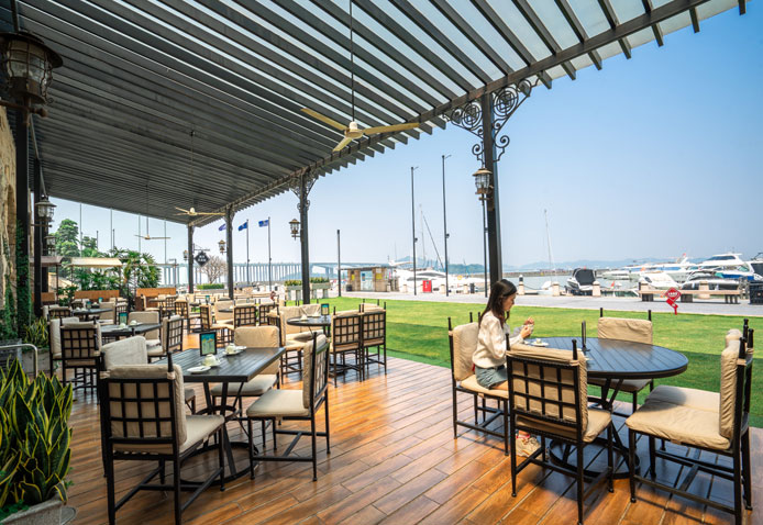 出海暢游一天后,夜幕低垂,最大的享受莫過于在戶外露臺(tái)與親朋摯友一面品嘗美食,回味卡布奇諾,一面盡瞰美麗的海灣景色。咖啡廳外的特色石廊和如蔭草坪也是年會(huì)活動(dòng)、客戶歡聚的適宜場(chǎng)地,無論是舉辦正式的燭光長(zhǎng)桌晚宴,還是小型私享音樂會(huì)搭配BBQ燒烤自助餐,揚(yáng)帆廊咖啡廳都將是您的至佳選擇。